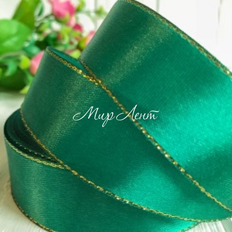 Атлас с люрексом 2,5 см (золото), зеленый, рулон 33 м