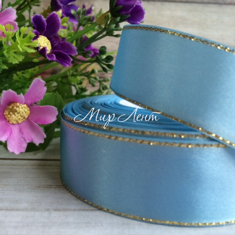 Атлас с люрексом 2,5 см (золото), голубой, рулон 33 м