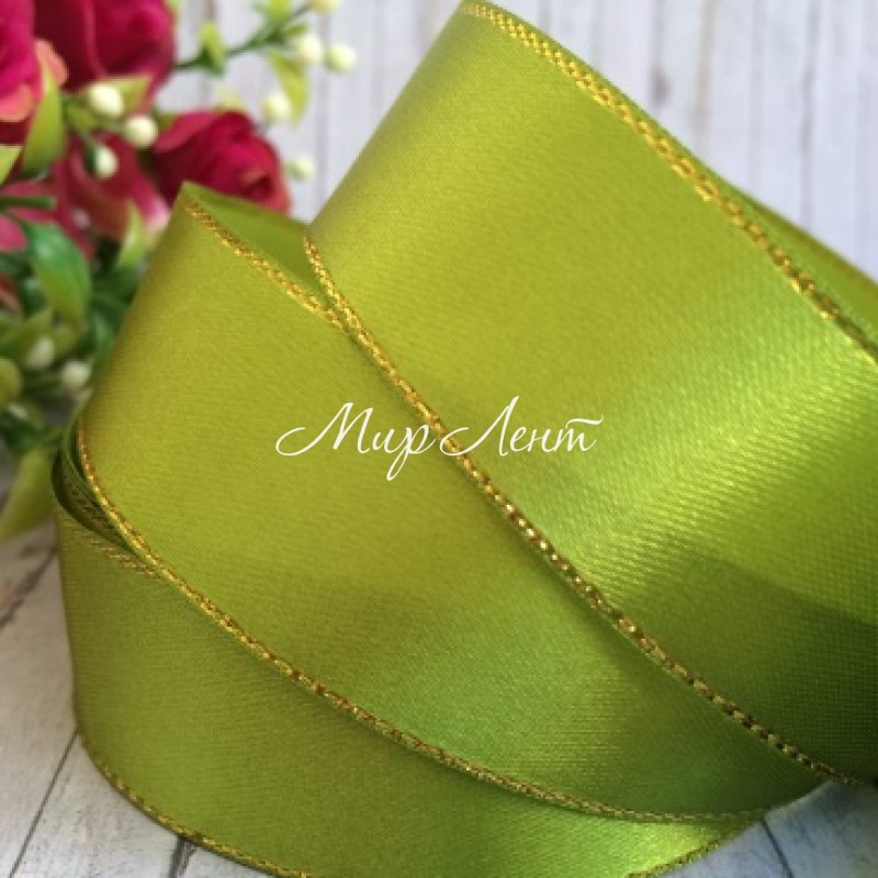 Атлас с люрексом 2,5 см (золото), оливковый, рулон 23 м