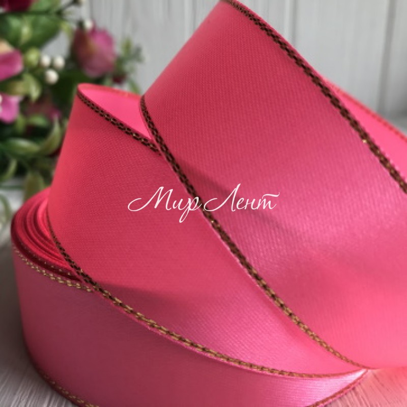 Атлас с люрексом 2,5 см (золото), ярко-розовый, рулон 33 м