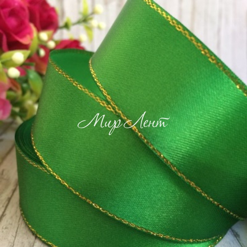 Атлас с люрексом 2,5 см (золото), светло-зеленый, рулон 33 м