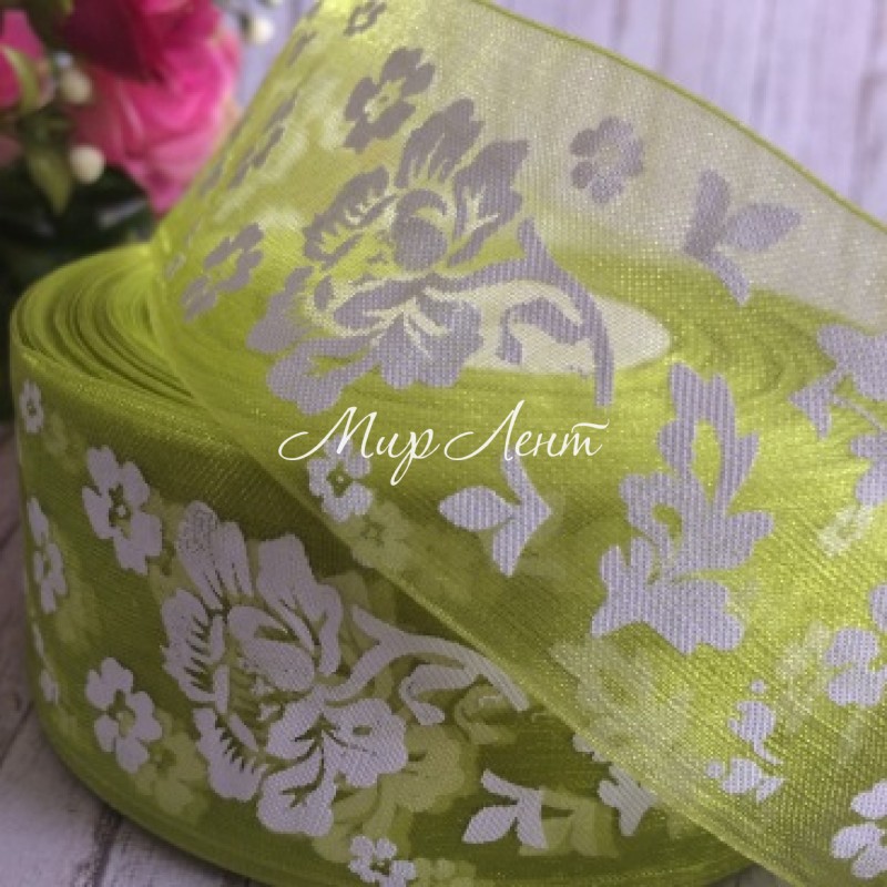 Атлас 2,5 см, розочка, бело-зеленая