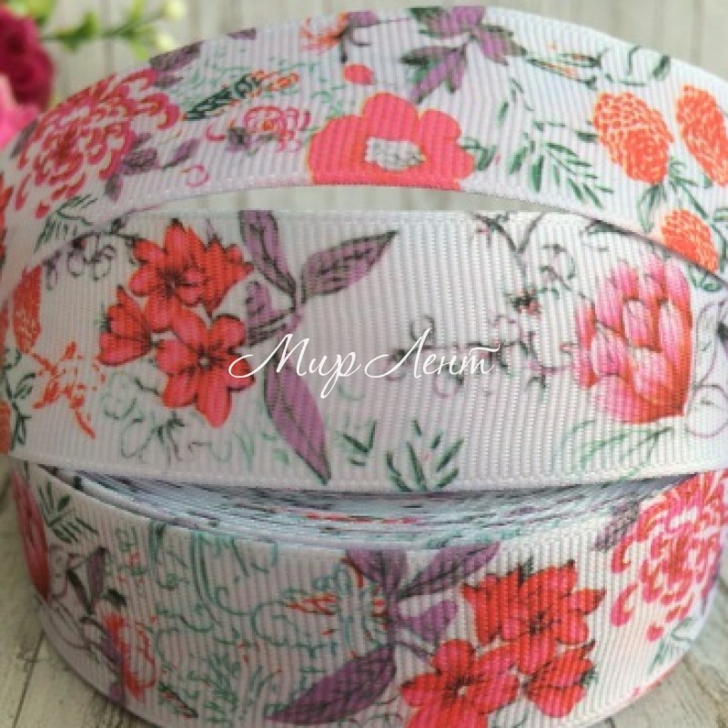 Репс 2,5 см, коралловые васильки на светло-розовом, 1 м
