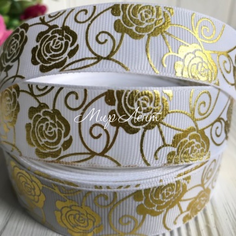 Репс 2,5 см, роза-голограмма золото на белом