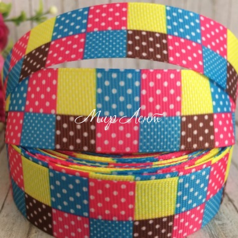 Репс 2,5 см, сине-малиново-коричнево-желтые квадраты с горохами, 1 м
