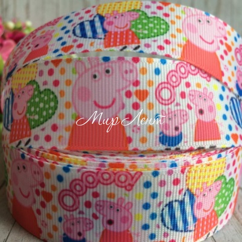Репс 2,5 см, свинка Пеппа, белый с разноцветным горохом, 1 м