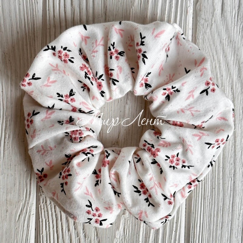 Скранч турецкий трикотаж, 12 см, белый с пудровыми цветочками, шт.