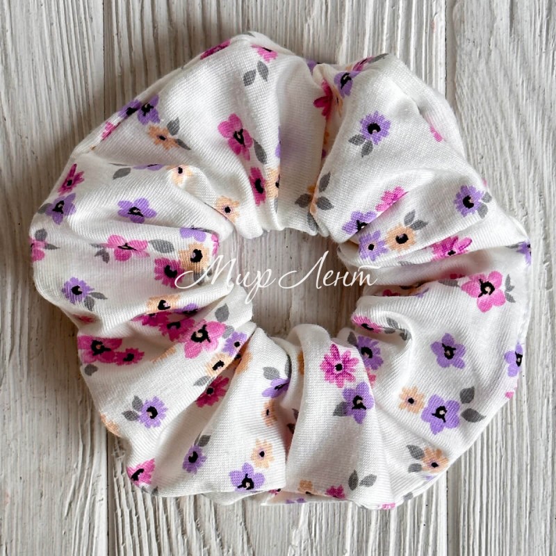 Скранч турецкий трикотаж, 12 см, белый с розово-лиловыми цветами, шт.