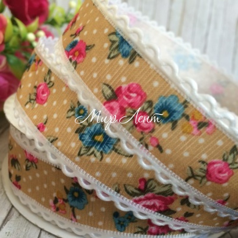 Лента с кружевным краем (горох и розы), 2,5 см, капучино