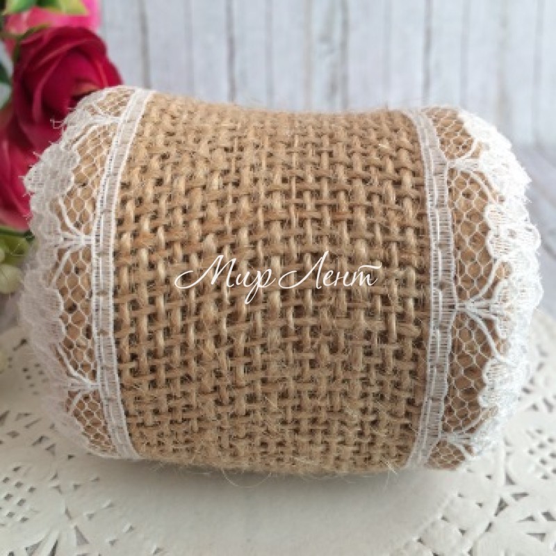 Стрічка-мішковина з мереживом (3 см), 5 см, білий, 2 ярди