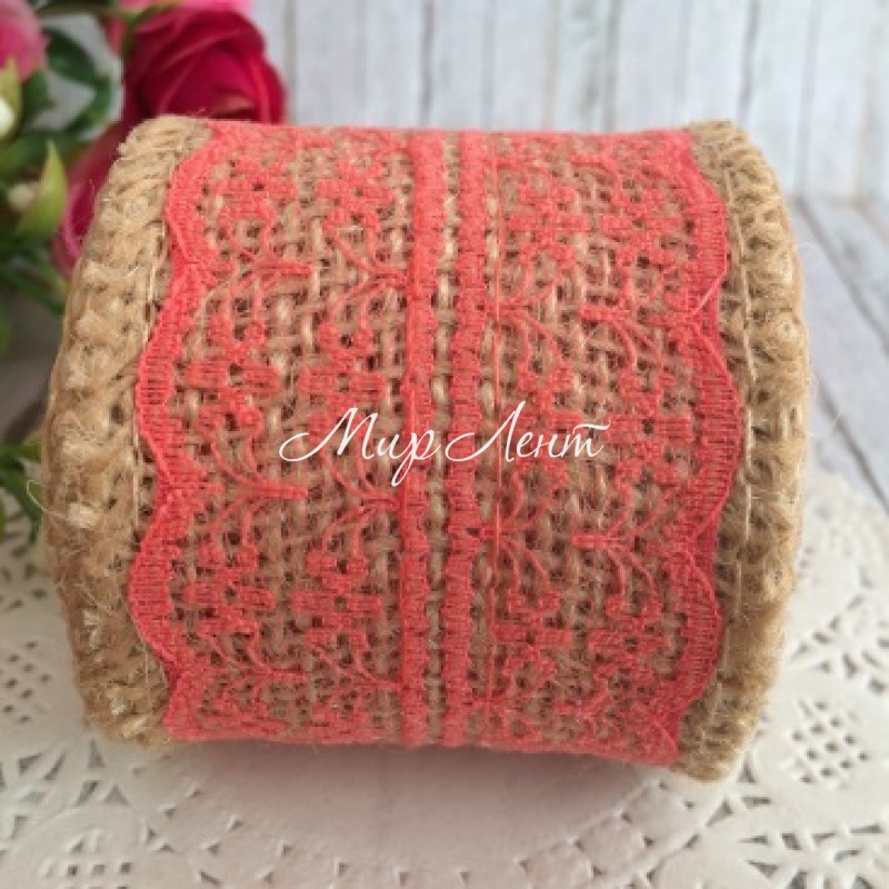 Стрічка-мішковина з мереживною квіточкою, 5 см, кораловий, 2 ярди