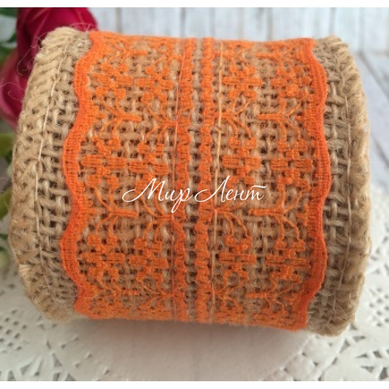 Стрічка-мішковина з мереживом квіточкою, 5 см, помаранчевий, 2 ярди