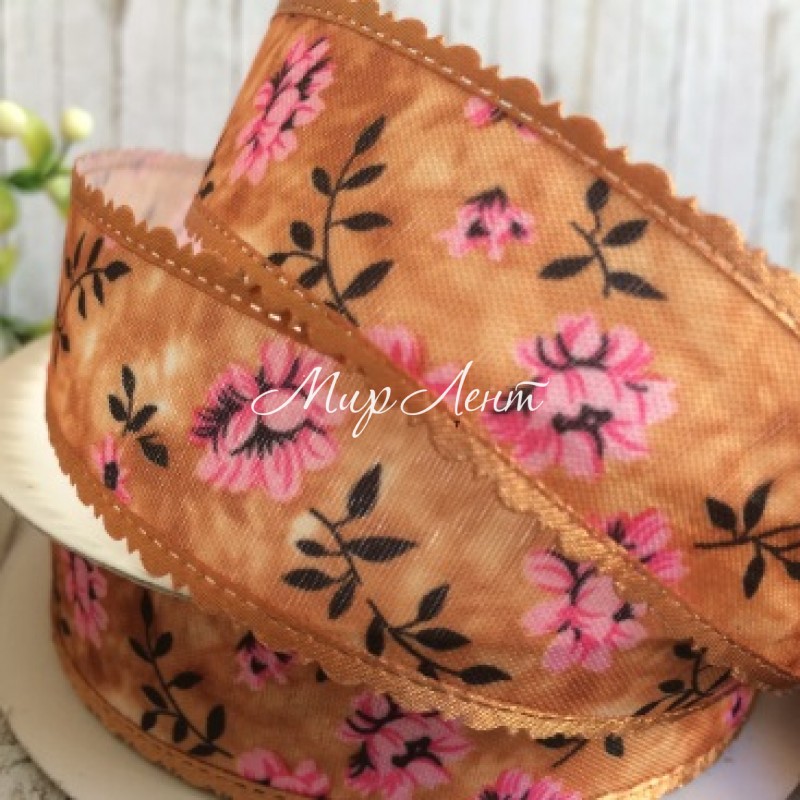 Стрічка тканинна з мереживним краєм (квіти), 2,5 см, бежево-коричневий