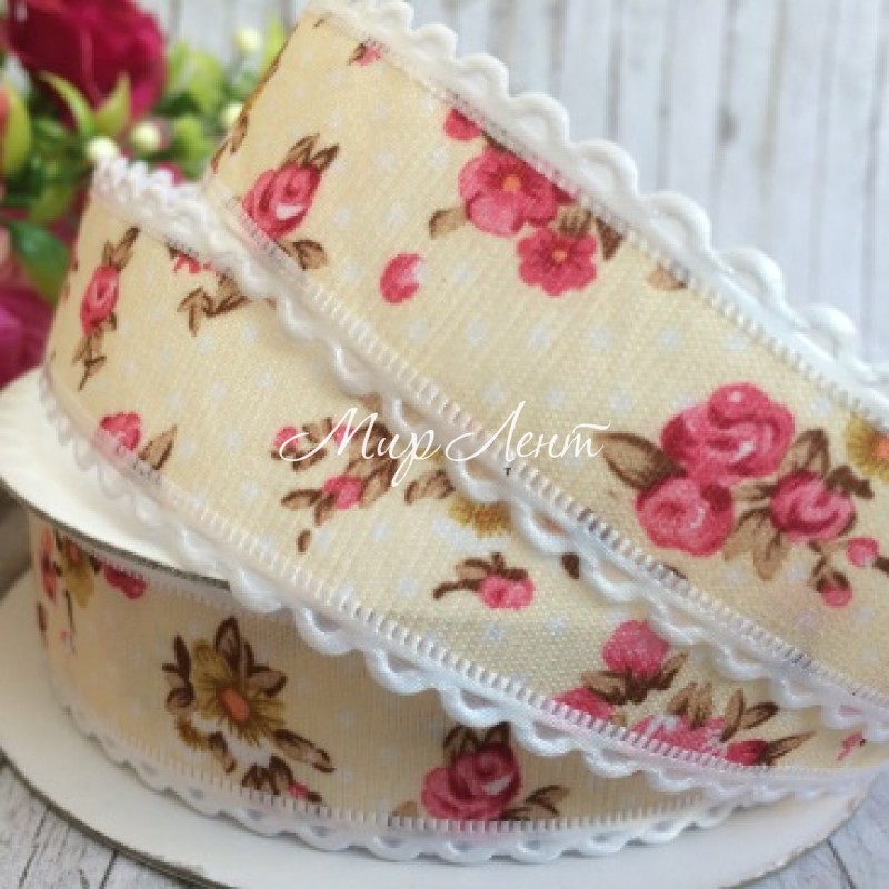 Стрічка з мереживним краєм (горох та троянди), 2,5 см, молочний