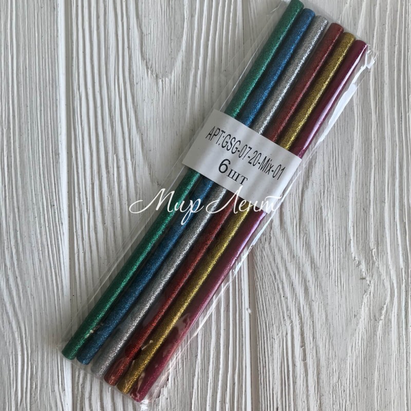 Термоклей 7 мм, кольоровий мікс із гліттером, 20 см, упаковка 6 шт.