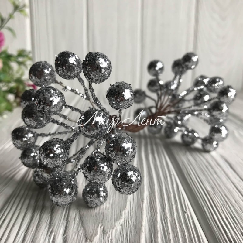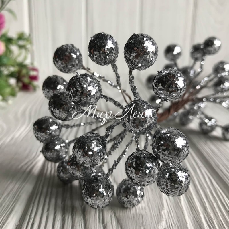 Ягідки з блискітками, 12 мм, срібло, пучок