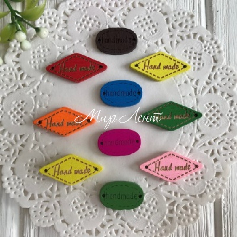 Ярлик дерев'яний Hand made, 1,9-2,7 см, овал та ромб (кольоровий мікс), упаковка 100 шт.